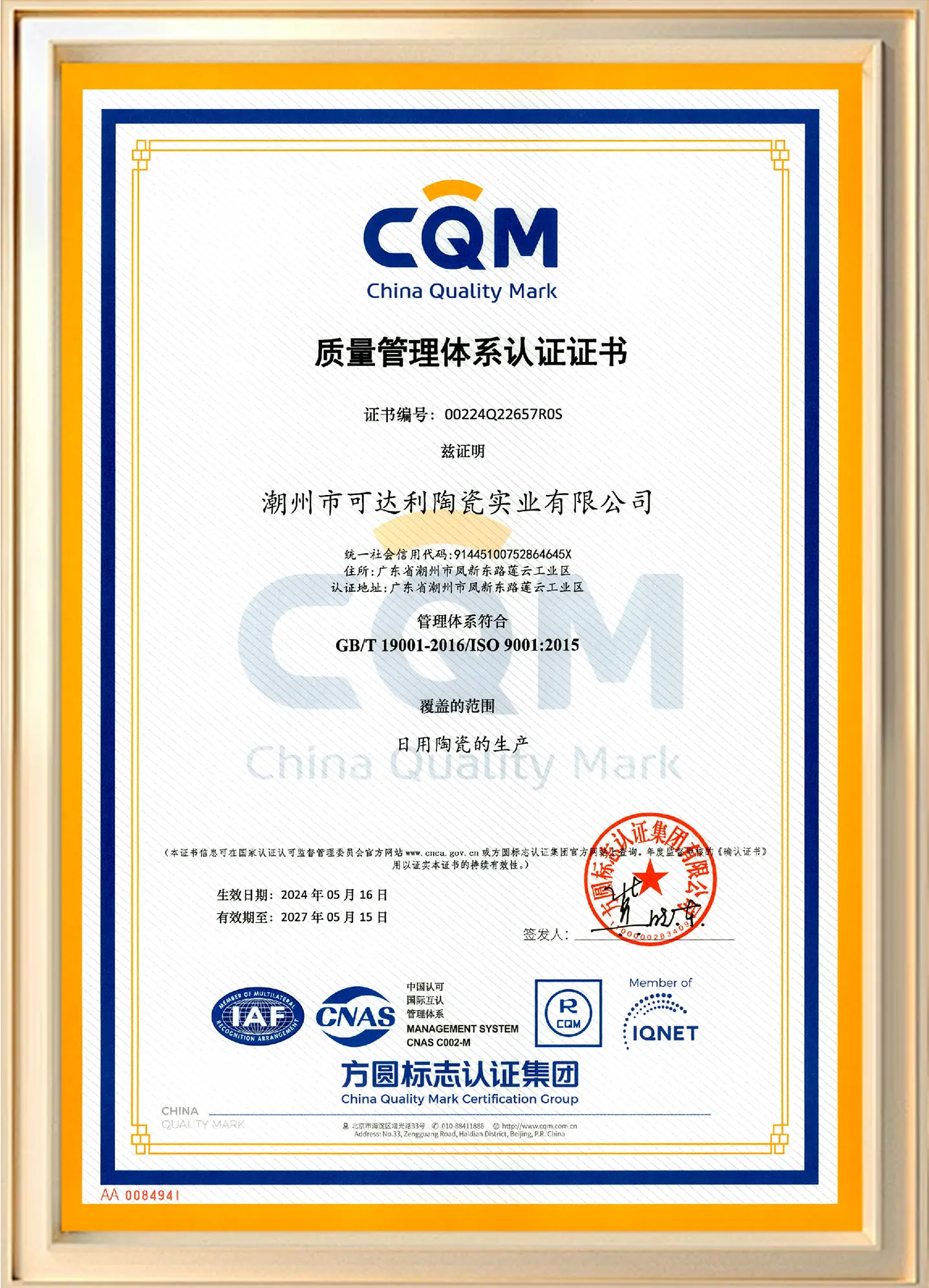 During this period, the company has received numerous honorary certificates, including "Certification for Daily-Use Ceramics Exported to the United States," "Quality Assurance Center Quality Management System Certification," and "Design Patent Certification." These certifications demonstrate the Kodali brand's unanimous recognition within and beyond the industry.