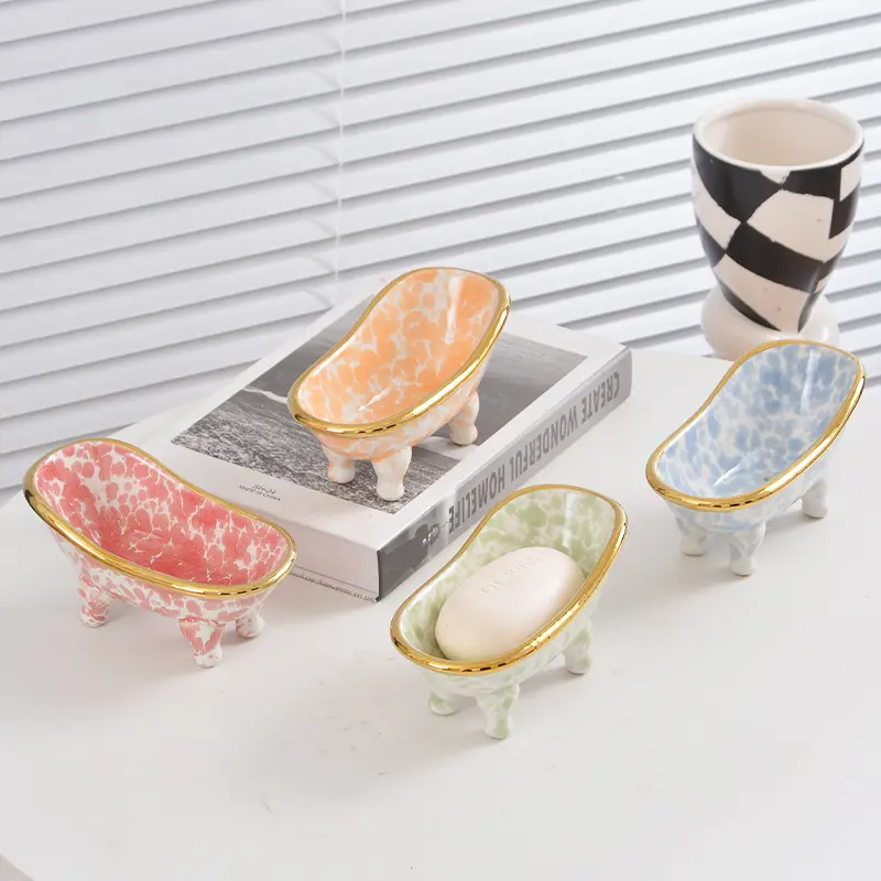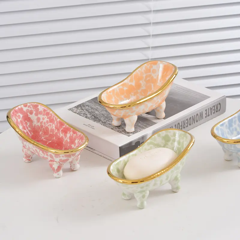 Nous sommes un professionnel soap dish manufacturer, supplying luxury mini bathtub-shaped ceramic soap dishes that combine elegant gold accents with classic clawfoot design. Each piece serves as both a functional soap holder and a decorative accent. With reliable quality control and stylish design, these soap dishes are a popular choice for enhancing bathroom aesthetics and adding a touch of high-end luxury.