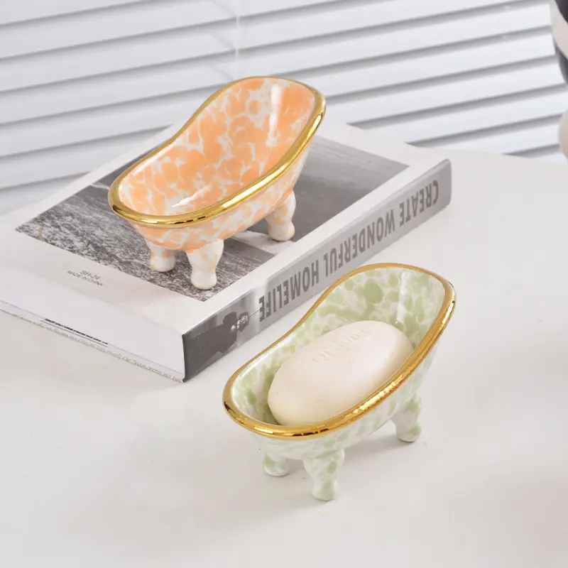 Luxury Soap Dish Wholesale, Mini Bathtub-shaped Ceramic Soap Dish with Gold Accents – Soap Dish Manufacturer