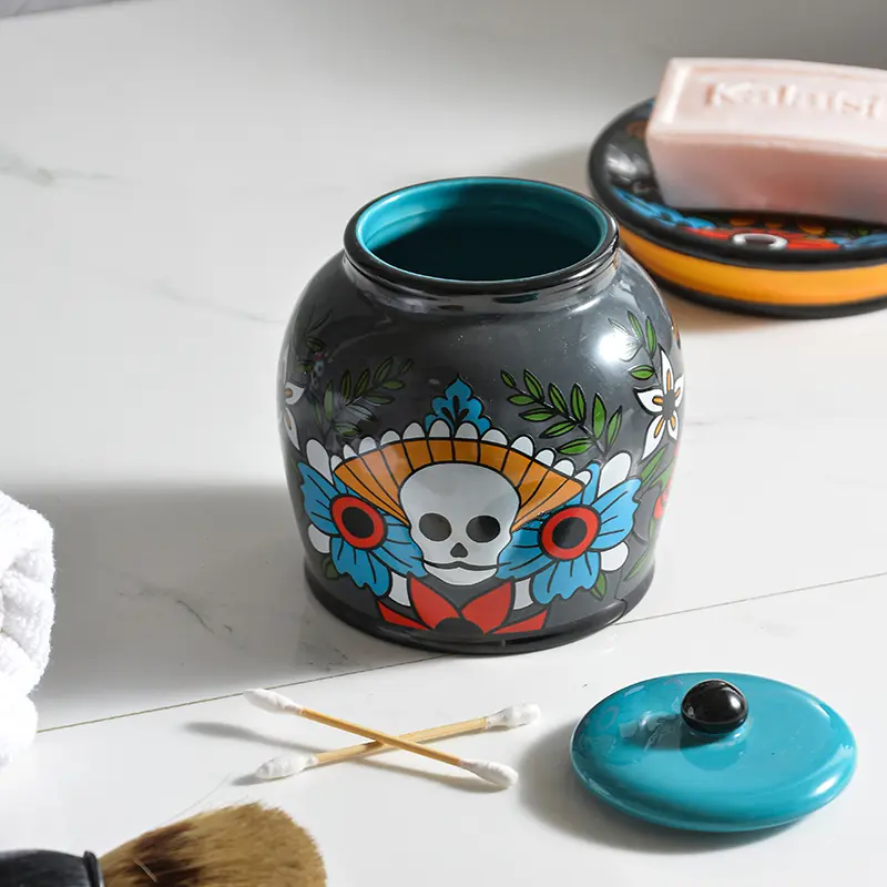 Wholesale Mexican Aesthetic Skull Pattern Bathroom Accessory Set. Inspired by iconic Mexican art and the vibrant spirit of Día de los Muertos, it adds a bold and colorful touch to themed hotels’ bathrooms and any other bathrooms.
