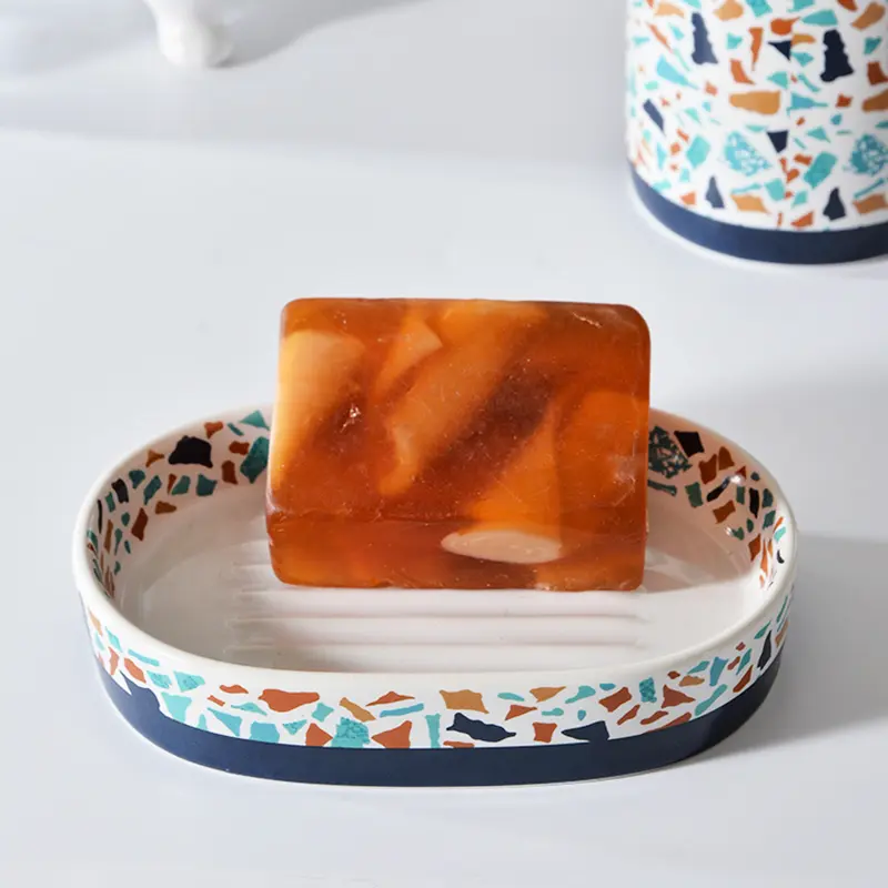 Wholesale terrazzo textured ceramic bathroom accessories set. This collection features exquisite terrazzo patterns and clean ceramic designs, adding subtle texture and visual depth to modern bathroom spaces.