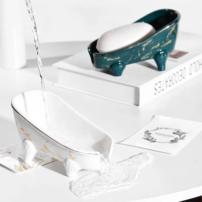 Wholesale ceramic soap dishes. This uniquely shaped soap dish, resembling a mini bathtub and adorned with delicate gold trim, elevates a simple bathroom item into a sophisticated decorative piece.