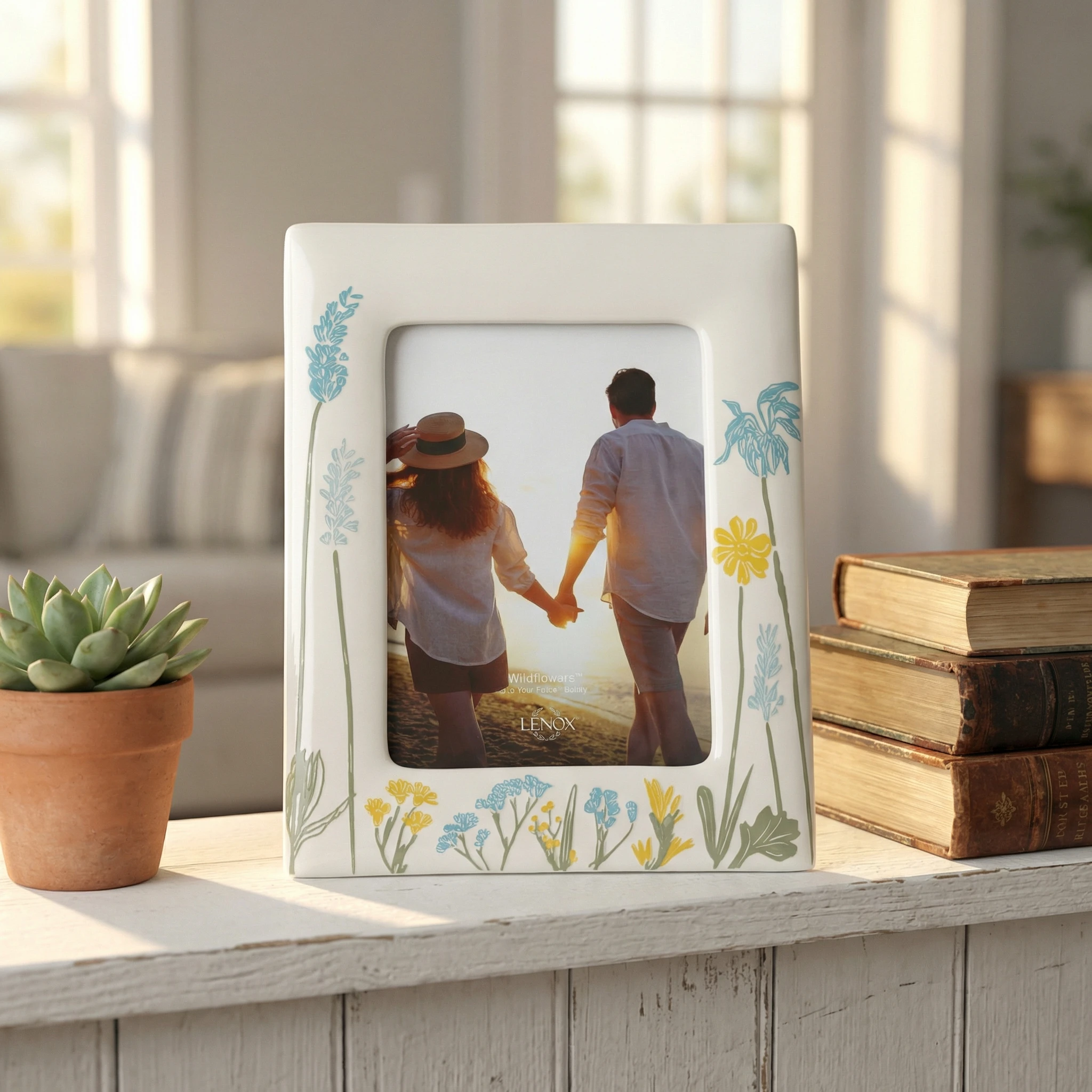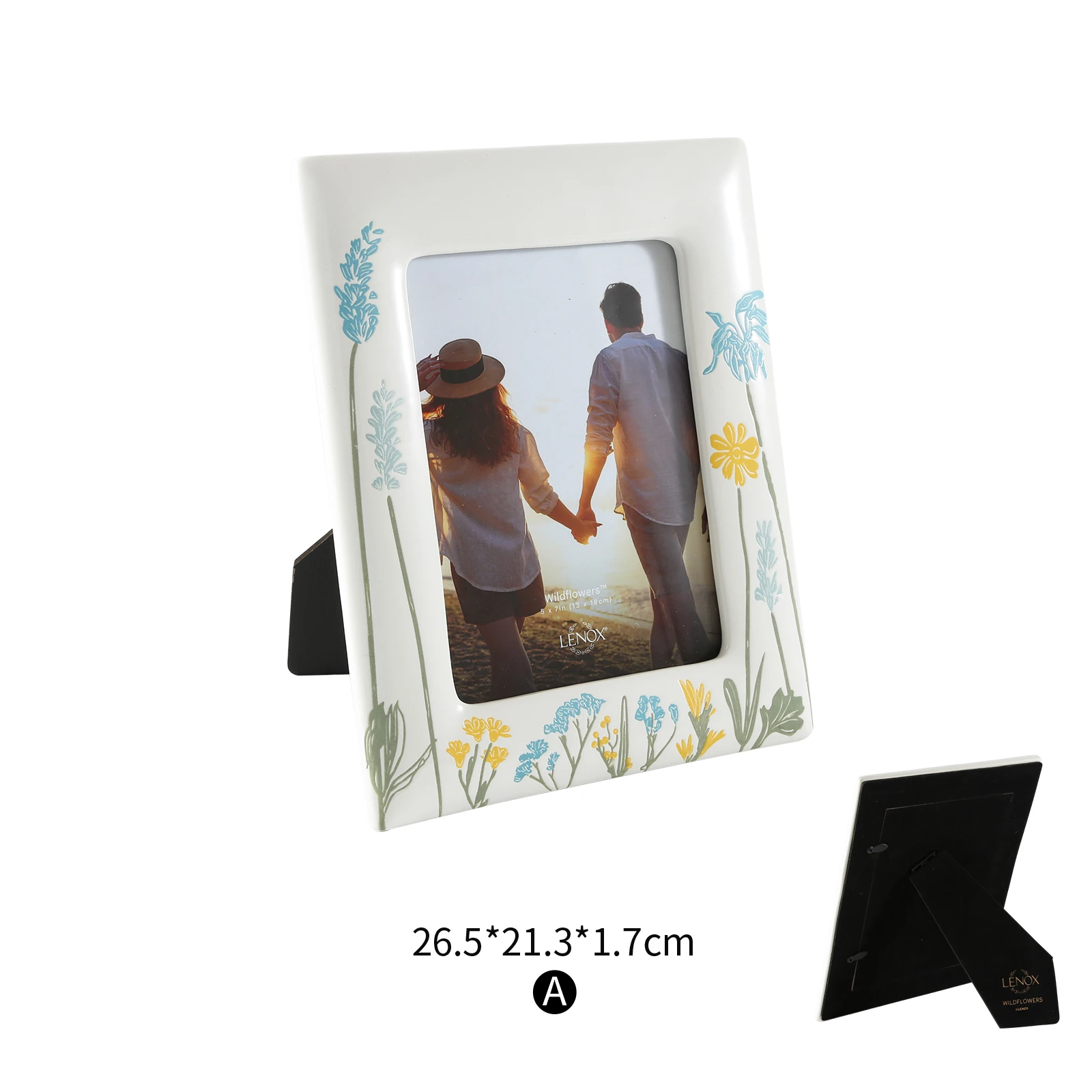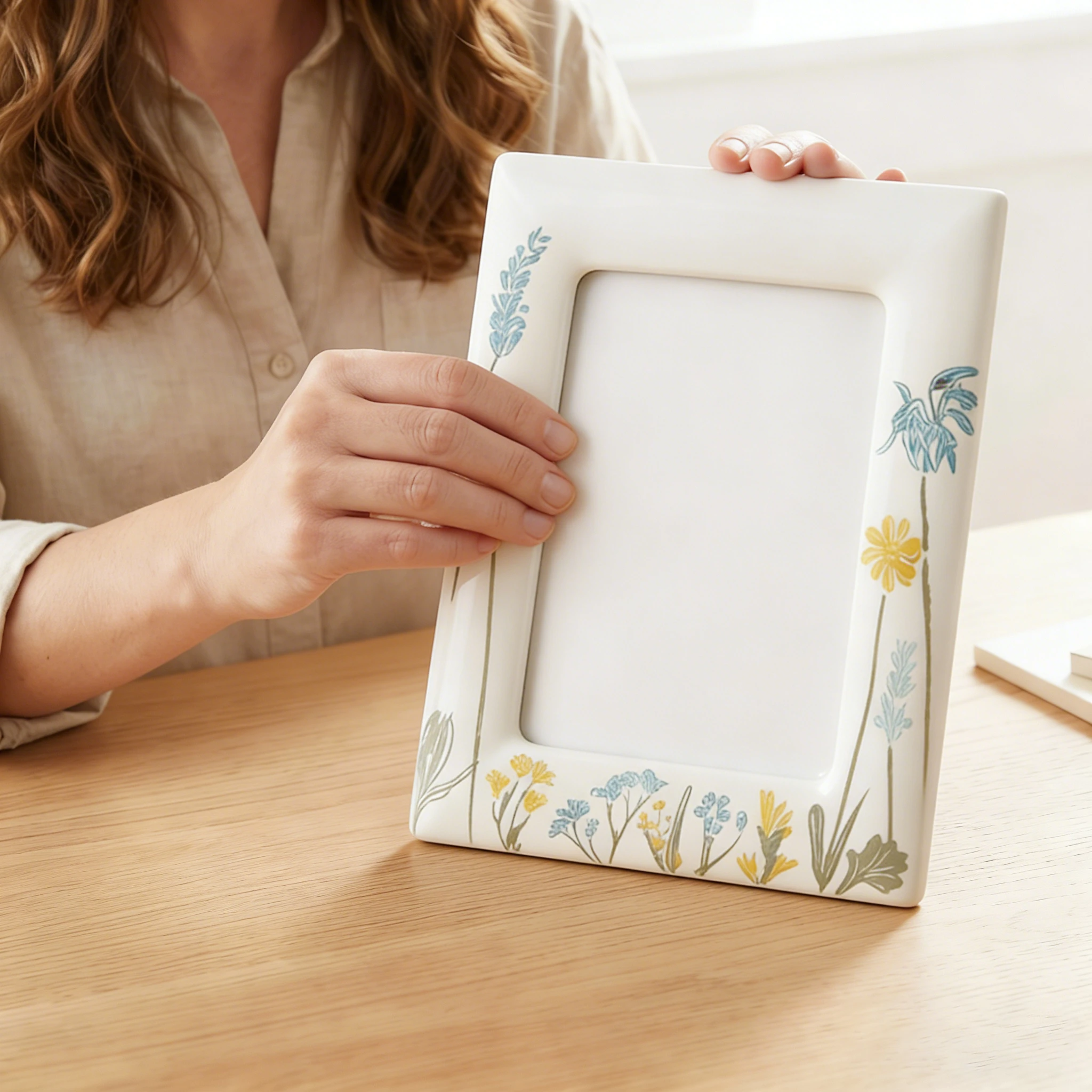 Wholesale exquisite ceramic photo frame. The surface features a delicate watercolor-style floral pattern. This picture frame is supplied to home decor retailers, boutique gift shops and global distributors to boost sales and meet the growing demand for elegantly designed home décor. Contact us for factory wholesale pricing.