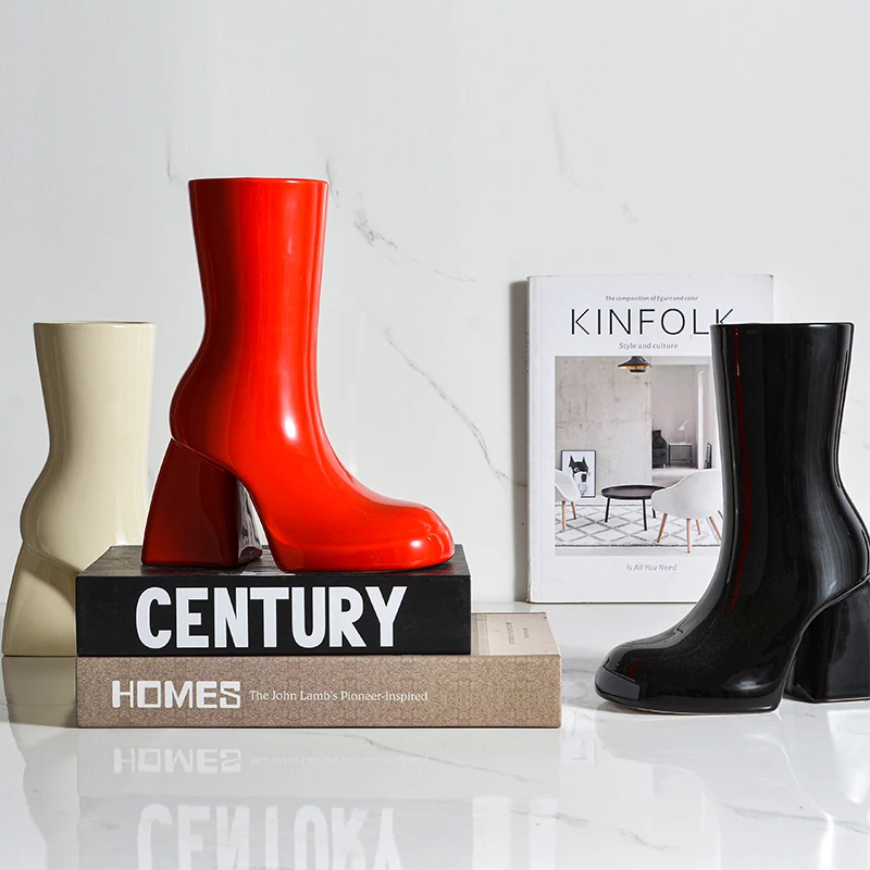 Wholesale creative ceramic vase. Inject a bold, avant-garde aesthetic into your product catalog with our High-Heel Boot Ceramic Vase collection. This creative vase effectively attracts attention, perfectly blending fashionable aesthetics with practical home decor. They are perfect for lifestyle boutiques, trendy gift shops, and interior design firms. The wide floral neck design is ideal for displaying large floral arrangements, but the sculptural design is impactful enough to be used as a standalone decorative piece.